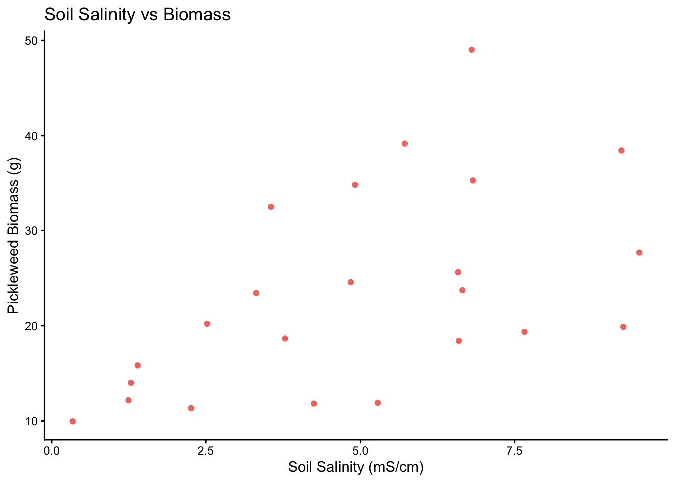 personal_data <- read_csv(here("data", "personal_data.csv"))a) In order to determine the strength of the relationship between salinity and California pickleweed biomass there are two appropriate tests, Pearson’s Correlation and Spearman’s Correlation. Pearson’s Correlation measures the strength and direction of a linear relationship without assuming one variable causes the other. Spearman’s Correlation is very similar, as it measures the strength and direction of the monotonic relationship between two ranked or continuous variables.
