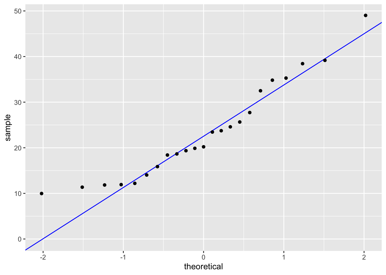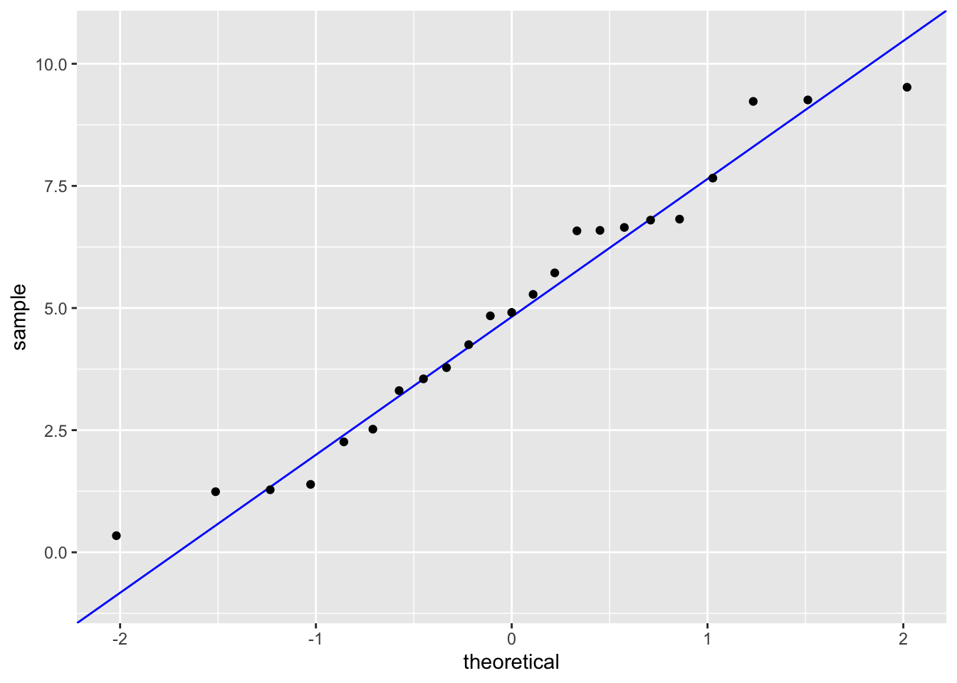 geom_qq_line(color = "blue") + #showing reference line in blue