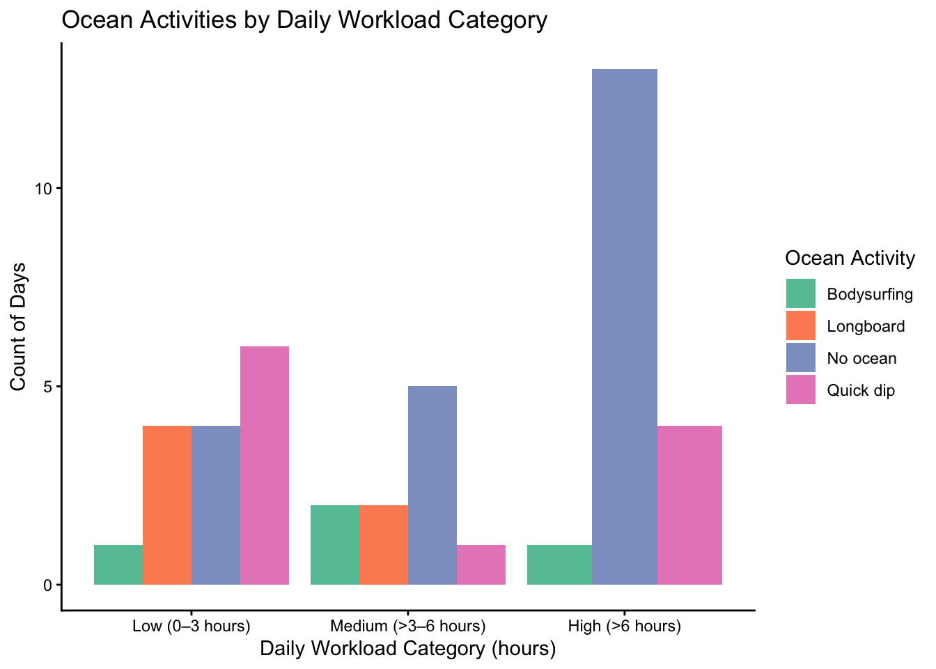 Figure 1: Ocean Activities by Daily Workload Category: This figure shows a box-plot, split into three categories on the x-axis (low workload, medium workload and high workload), containing up to four bars, with each bar corresponding to a unique ocean activity (no ocean, quick dip, body surfing and long boarding). The y-axis is simply number of days or count.
