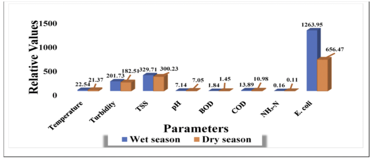b) The authors present their statistics fairly clearly in the figure. The x-axis lists the water quality parameters, while the y-axis represents the concentrations of those parameters. This allows for easy comparison between wet and dry seasons. Seasonal differences are visually distinguished using separate colored bars, which helps highlight patterns such as the large change in EColi. However, the figure shows only summary values and does not display variability, such as standard error or the underlying raw data.