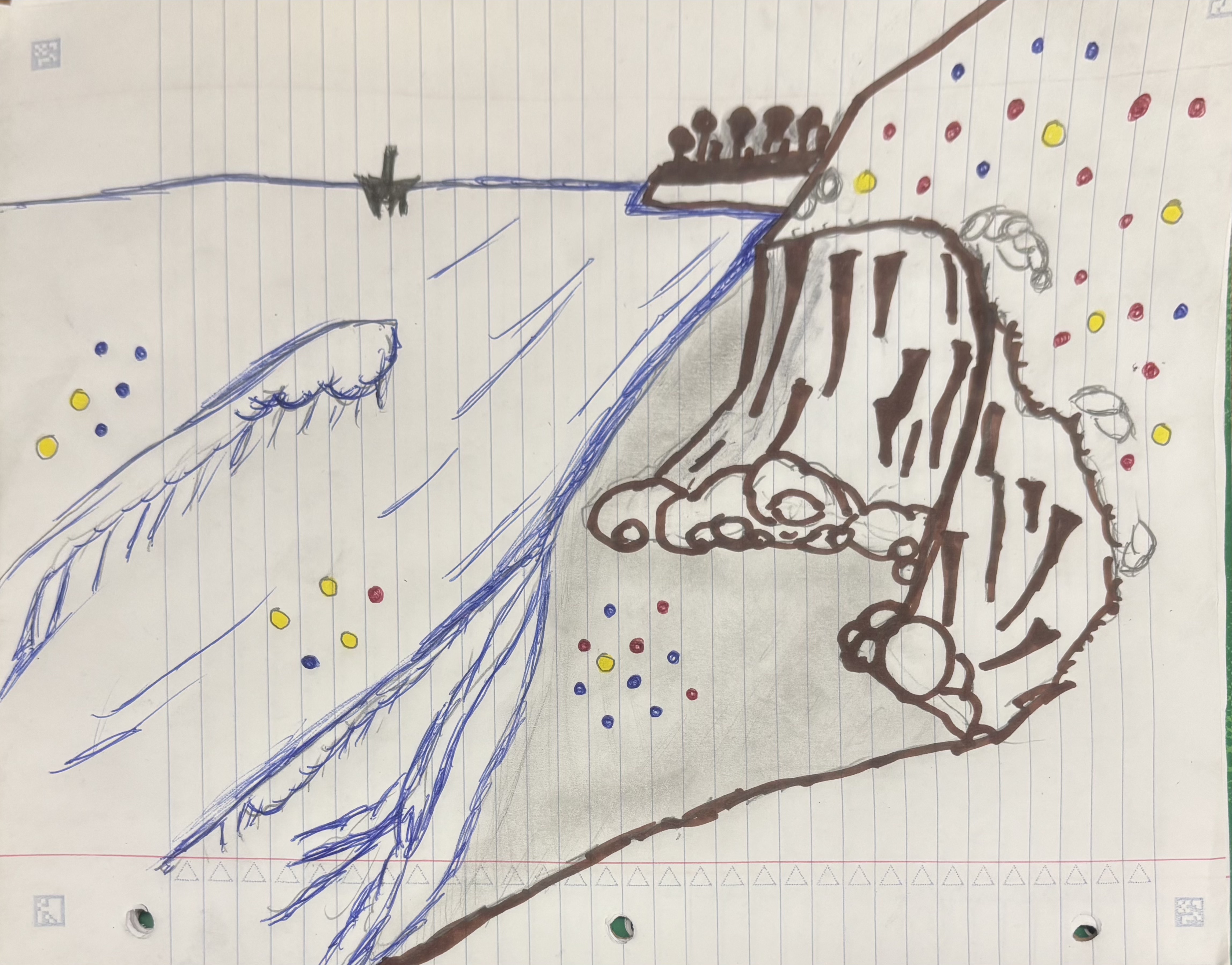 d. This piece is a visual representation of personal data that I have collected over the past month and a half. Each colored point represents a day and the color corresponds to a daily workload category (blue = < 3 hours of work, yellow = 3 - 6 hours of work, red = 6+ hours of work). The location of each point represent an ocean activity I did that specific day (on the bluffs = no activity, on the beach = quick dip, in the shore break = body surfing, past the wave = long boarding). I took a lot of inspiration form Jill Pelto’s paintings, as she incorporates a lot of landscapes and backdrops into her data visualization. The draft is simply a sketch, but for the final draft I plan on making a watercolor painting. The process was fairly simple, the hardest part was definitely deciding how I was going to visualize my data. However, I think I landed on a cool idea. I first drew the landscape/background, then I added color and finally I added my data points to their respective locations.